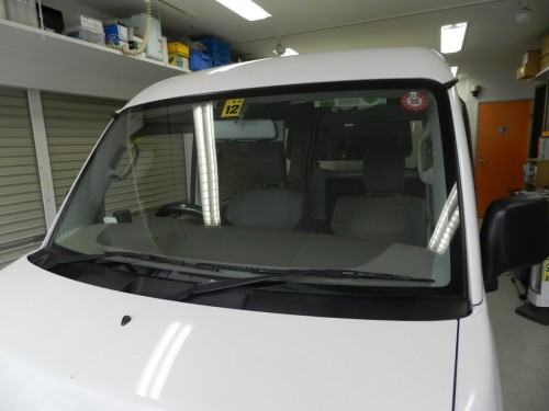 走行中に飛び石が当たり、右下の方から約20センチのヒビができてました。T様の希望で、上のほうにボカシが入ったガラスが良いとの事でしたので、断熱ガラス「エンゼルガード’99」の提案したところ、気に入って頂き、翌日施工する事になりました。